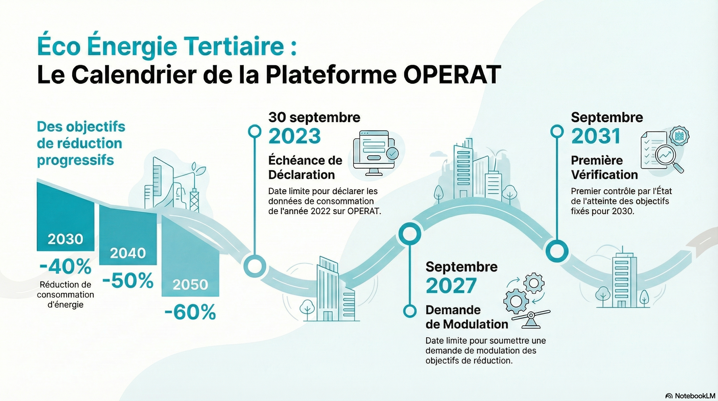- Ou d’atteindre un seuil en valeur absolue (de l’ordre de 110kWh/m² par an en 2030, pour des bureaux par exemple).rouver l’atteinte des objectifs de réduction de consommation (40%, 50%, 60% ou seuil en valeur absolue) et simplifie la vérification de l’atteinte des objectifs réglementaires exigée par OPERAT.